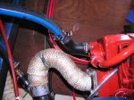 If you have the high rise exhaust elbow, this must be removed to get the tube stack out. The other alternative is to remove the alternator but that is much more involved. If you have the standard exhaust elbow, there is only the water hose to remove.