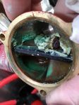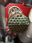 Long story: We pumped as much coolant out of the heat exchanger as we could prior to trying to remove the tube stack for cleaning and inspection. We decided to do this because the zinc anode had corroded and broken off from the plug that it's mounted to, and we figured we'd better see if electrolysis had become an issue in the heat exchanger. We couldn't get the tube stack out because the hi-rise exhaust blocks it from sliding far enough back to extract it (removed the heat wrapping, pipe still blocks tube stack. Will come back after it when we have some replacement gaskets for the exhaust pipe). So, cleaned in situ as much as possible, shined light through each tube to verify that they weren't blocked, reassembled, and carried on. At this point, we opened the coolant drain pet**** and got nothing (fill cap was off the engine). After replacing the raw water impeller and cleaning out the raw water strainer, we decided to put the old coolant back in the system until we could figure out how to drain and flush.