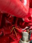 The coolant block drain will be on the side of the block aft of the oil filter. Please note, that if this engine has custom mounts, the block drain tap may have been plugged up to allow for the custom feet. If this is so, then remove the lower hose.